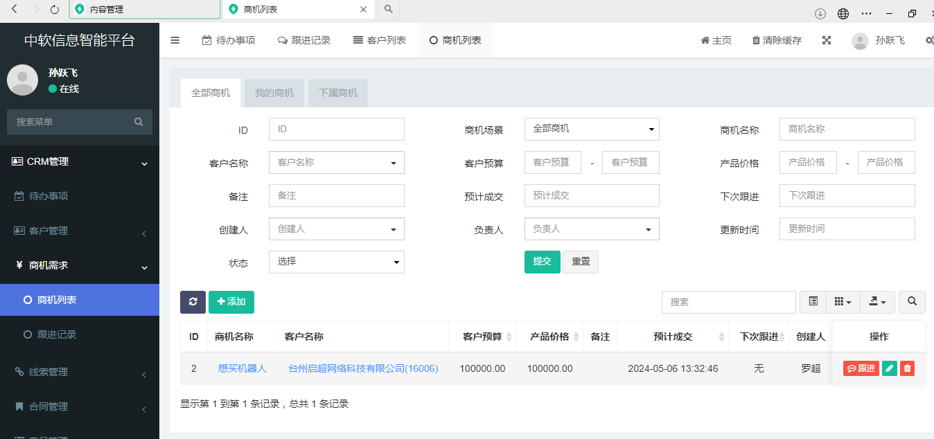 佐竹机械通过中软CRM自定义了一个非常有层次的表单,里面包含了客户要上手产品所需要的各种信息和工作要素,在客户签订合同后就会自动触发公司内的一个流程。这些工作流程向员工发出信号,告知他们要对客户采取哪些行动以及何时采取行动。